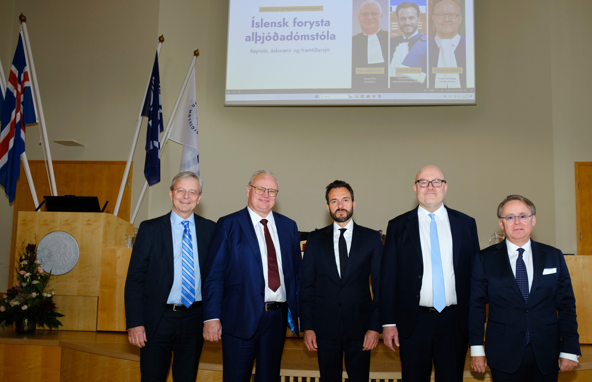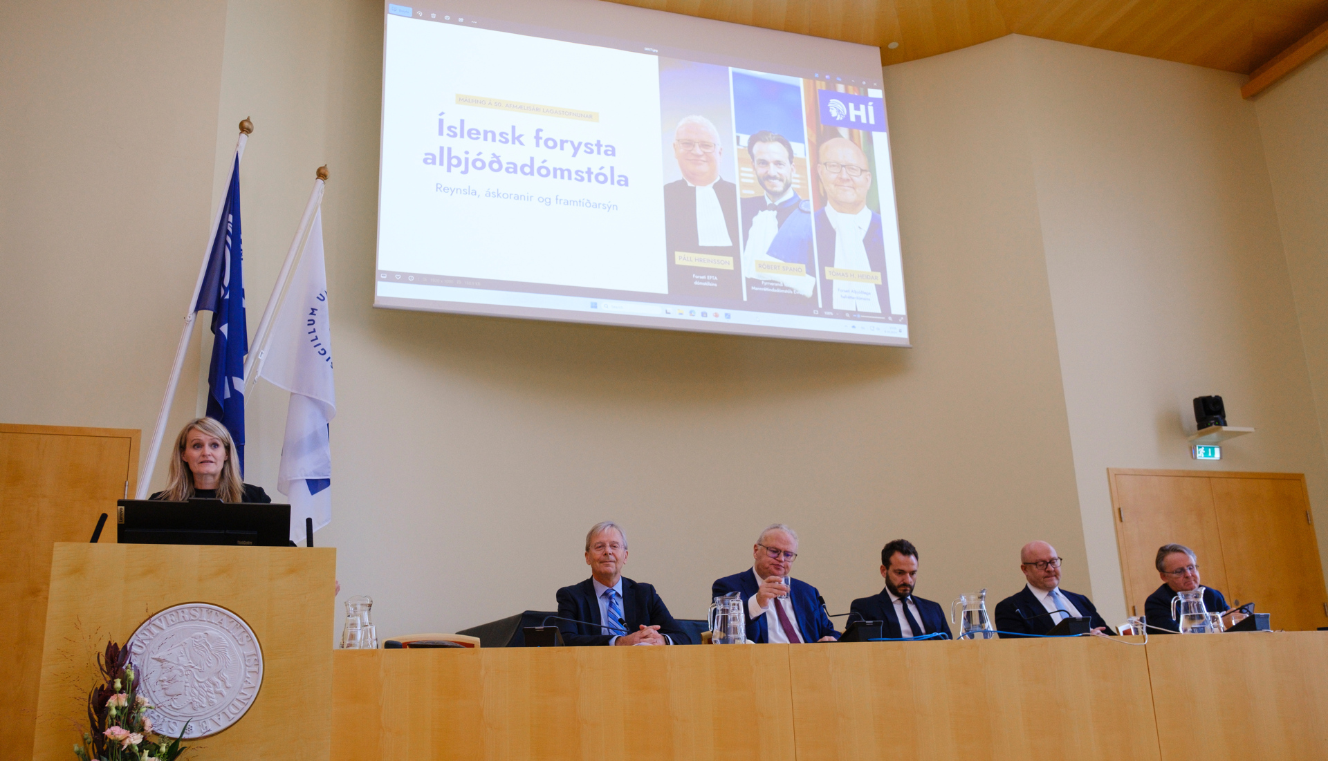 Í tilefni af 50 ára afmælis Lagastofnunar hélt stofnunin málþing í Hátíðasal HÍ 9. október sl. þar sem þrír dómsforsetar við alþjóðlega dómstóla - Páll Hreinsson, forseti EFTA-dómstólsins, Róbert R. Spanó, fyrrverandi forseti Mannréttindadómstóls Evrópu, og Tómas H. Heiðar, forseti Alþjóðlega hafréttardómsins - ræddu reynslu sína af störfum þar og áskoranir alþjóðlegra dómstóla í bráð og lengd. Benedikt Bogason forseti Hæstaréttar Íslands lauk málþinginu með stuttu erindi en stjórn málþingsins var í höndum Ásu Ólafsdóttur hæstaréttardómara.